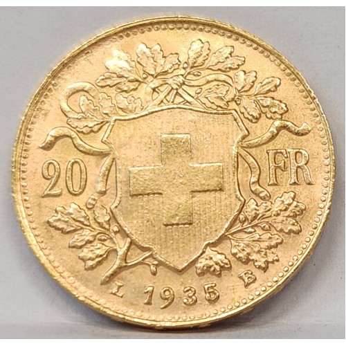 SWITZERLAND 1935 B . TWENTY 20 FRANCS . GOLD COIN