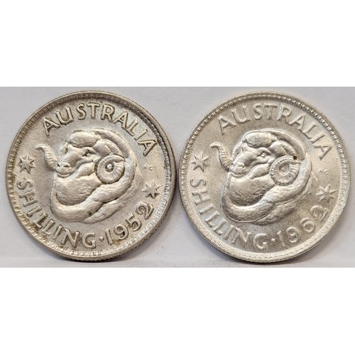 Australia 1952 and 1962 One 1 Shillings. Key Dates. High Silver. Very Scarce in