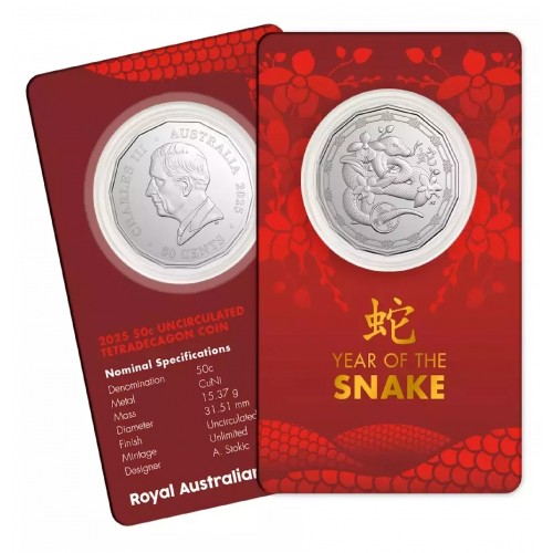 Australia 2025 Fifty 50 Cents Coin. Year of the Snake. Coin on Card.