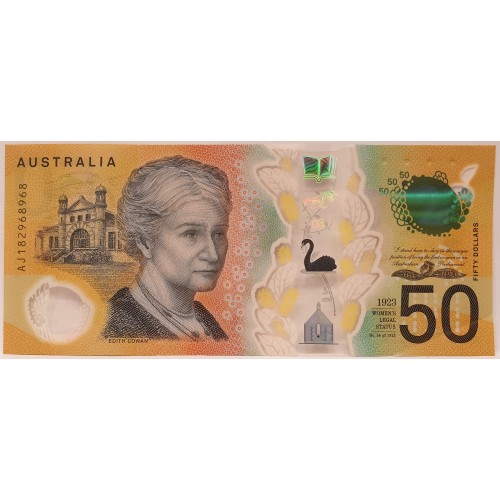 Australia 2018. Fifty 50 Dollar Banknote. Serial: AJ182968968. Lowe/Fraser.