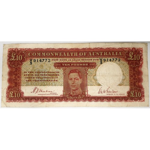 Australia 1940. Ten 10 Pounds Banknote. Sheehan/McFarlane. Serial: V3 914772.