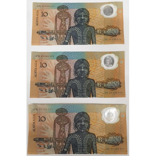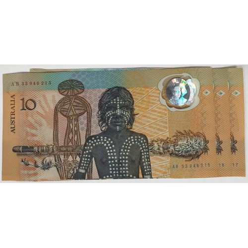 AUSTRALIA 1988 . TEN 10 DOLLARS BANKNOTE . FRASER/JOHNSTON . CONSECUTIVE TRIO . LAST PREFIX AB33