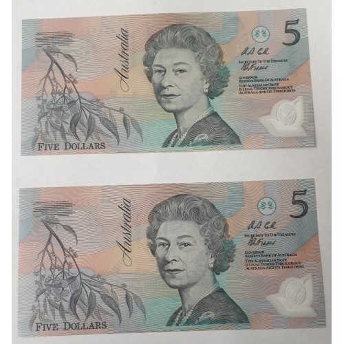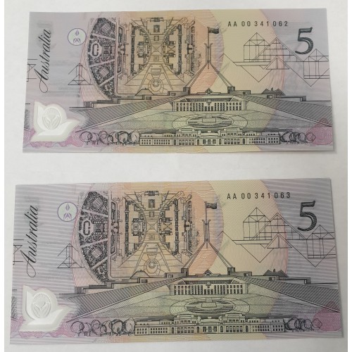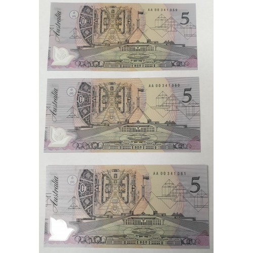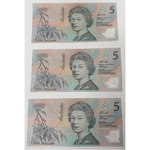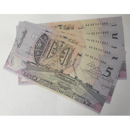 Australia 1992. Five 5 Dollar Banknotes. Serial: AA00341059-63. Cole/Fraser.