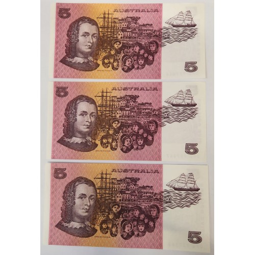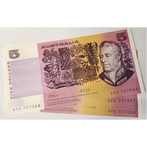 AUSTRALIA 1991 . FIVE 5 DOLLARS BANKNOTE . FRASER/COLE . CONSEC TRIO . LAST PREFIX QPG