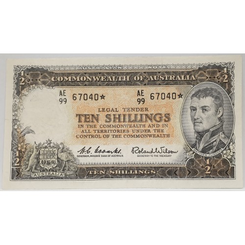 Australia 1961 Ten 10 Shillings Banknote. Serial: AE99 67040*. Coombs/Wilson.