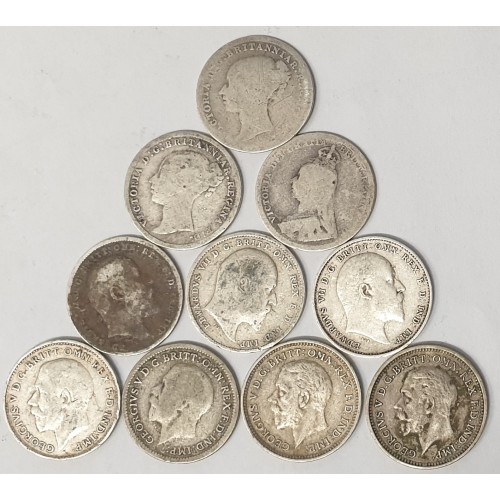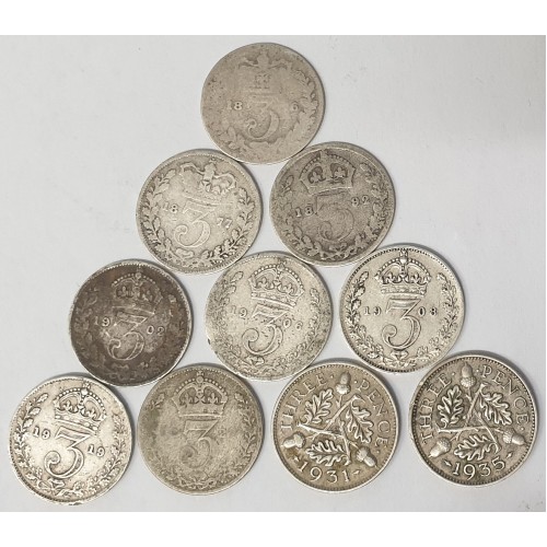Great Britain UK 1876-1935. Threepence. Lot of 10 Coins. Incl 1877