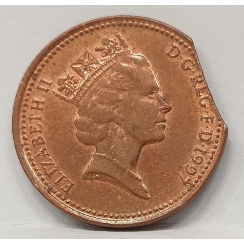 GREAT BRITAIN UK 1997 . ONE 1 PENNY . ERROR . CLIPPED FLAN . BITTEN EDGE