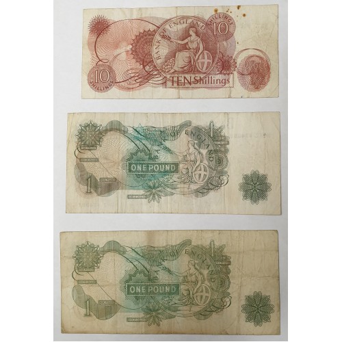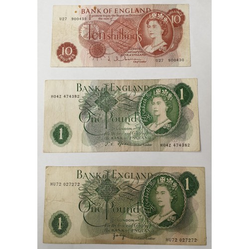 GREAT BRITAIN UK 1966/1970 . TEN 10 SHILLINGS AND ONE 1 POUND BANKNOTES . 3 DIFFERENT SIGNATURES