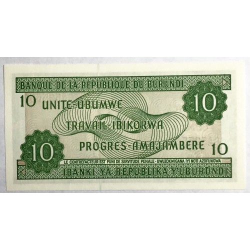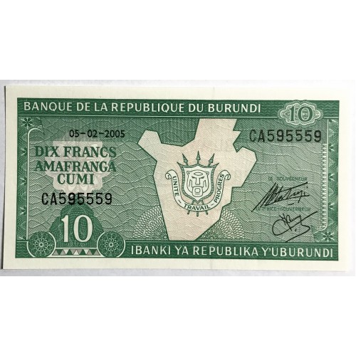 Burundi 2005. Ten 10 Francs Banknote. Serial: CA595559. Choice Uncirculated.