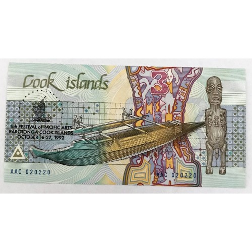 Cook Islands 1992. Three 3 Dollars Banknote. Serial: AAC020220. 6th Festivial of