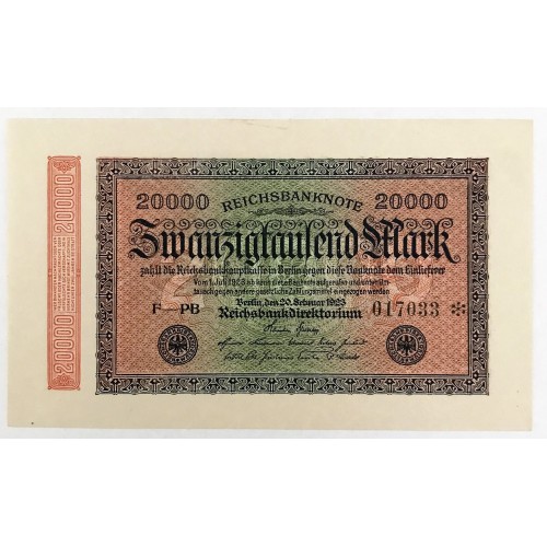 Germany 1923. Twenty Thousand 20,000 Mark Banknote. Serial: 017033*.