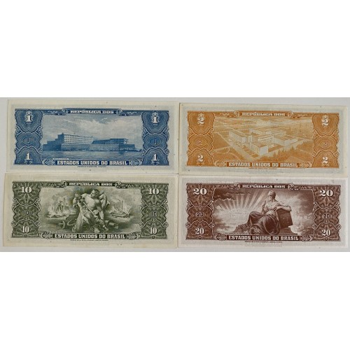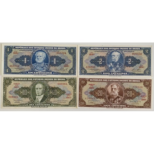 Brazil 1953-1959 One 1, Two 2, Ten 10, Twenty 20 Cruzeiros Banknotes.