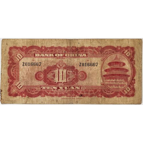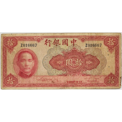 China 1940 Ten 10 Yuan Banknote. Serial: Z016667. Red Serials with 7 Characters