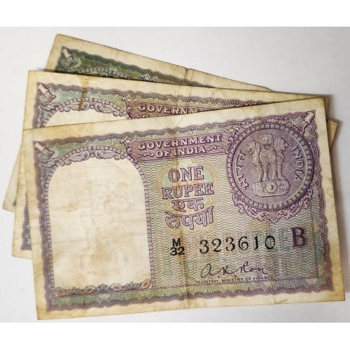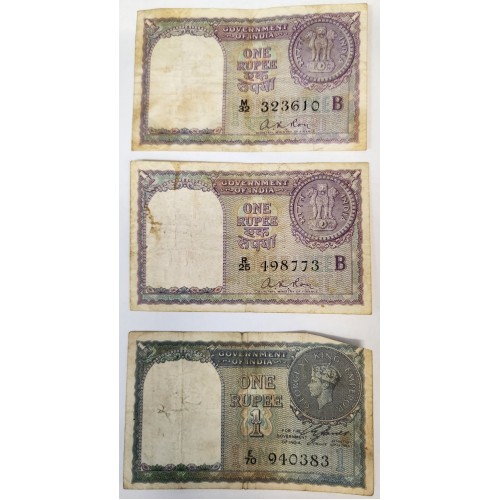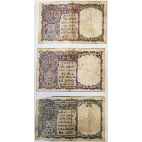 India 1940 3 x One 1 Rupees Banknotes. Serial: E70/940383, R25/498773,