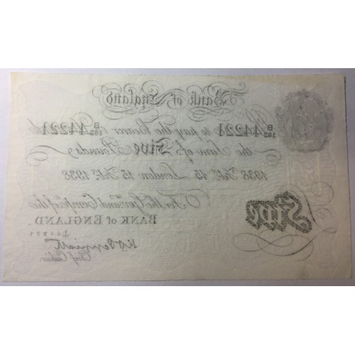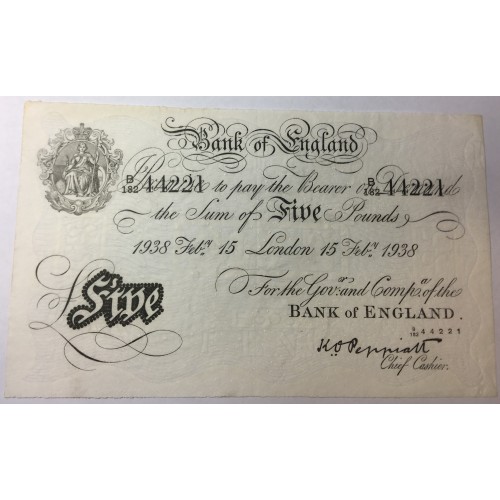 Great Britain UK 1938. Five 5 Pounds Banknote. S/No: B182 44221.
