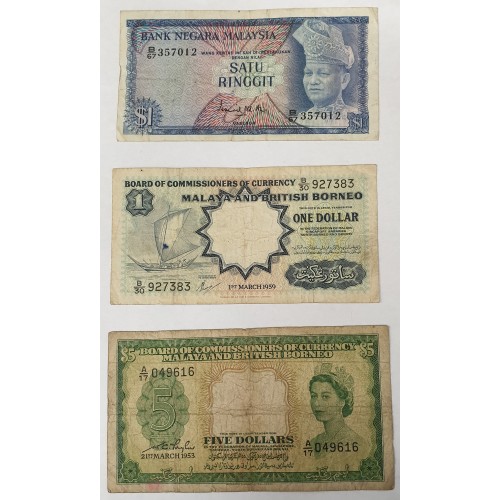 Malaysia 1953 - Five 5 Dollars. 1957 - One 1 Dollar. 1967 - One 1 Dollar. Rare.