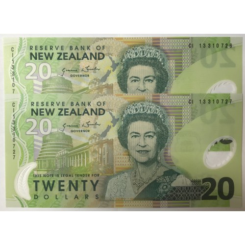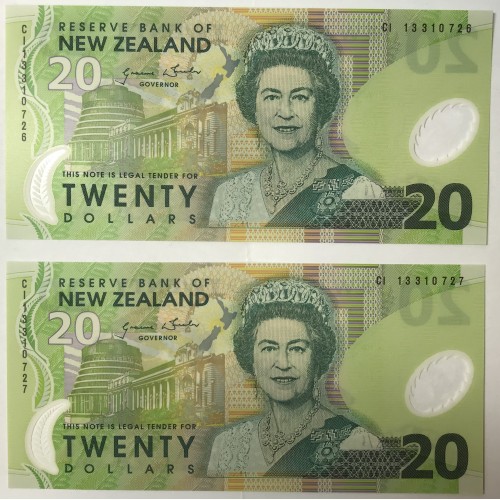 New Zealand 2002 Twenty 20 Dollar Banknotes. Serial: CI13310726-7.