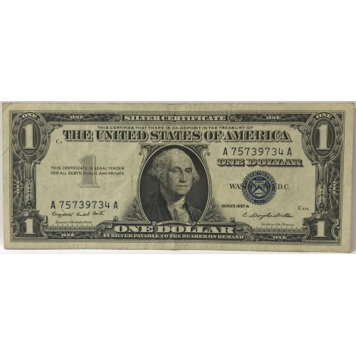 United States of America 1957 One 1 Dollar Banknote. Serial: A75739734A.