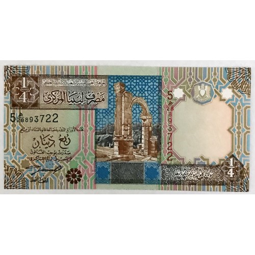 Libya 2002 1/4 Quarter Dinar Banknote. Serial: 5/28 893722. Choice Uncirculated