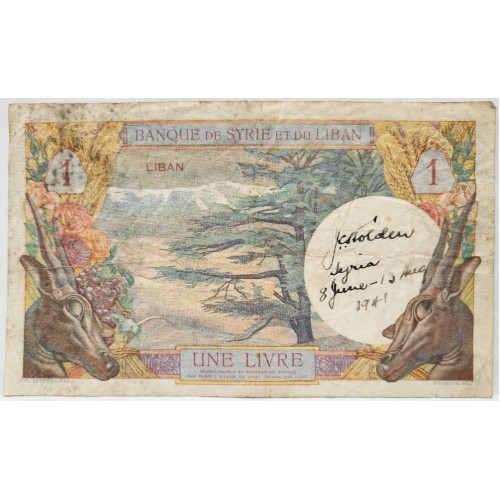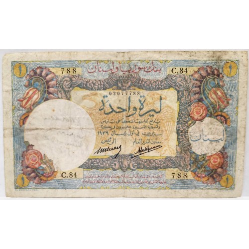 Lebanon 1939 One 1 Livre Banknote. Serial: C.84 788/02077788. Checkers