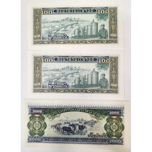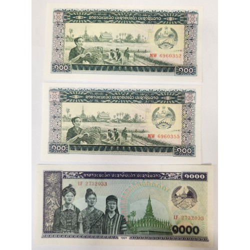 Lao 1992 2x One Hundred 100 and One Thousand 1,000 Kip Banknotes. Scarce.