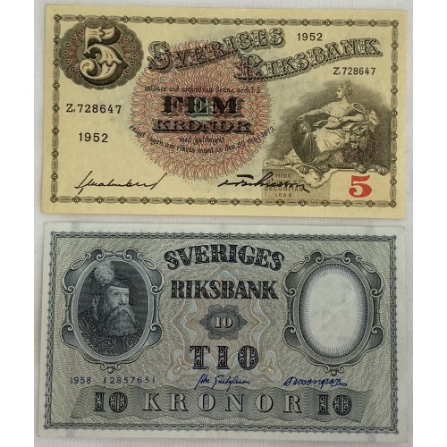 SWEDEN 1952-1958 . FIVE 5 and TEN 10 KRONER BANKNOTES