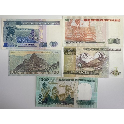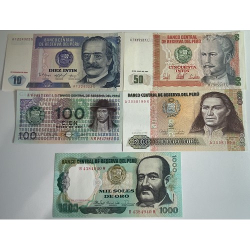 PERU 1976-1987 . TEN 10 - FIVE HUNDRED 500 INTIS and ONE HUNDRED 100 - ONE THOUSAND 1,000 CIEN BANKNOTES . SET OF 5