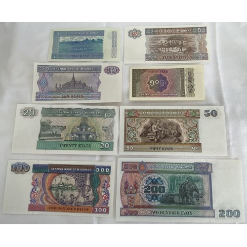 MYANMAR 1996 . FIFTY 50 PYAS - TWO HUNDRED 200 KYATS BANKNOTES . SET OF 8