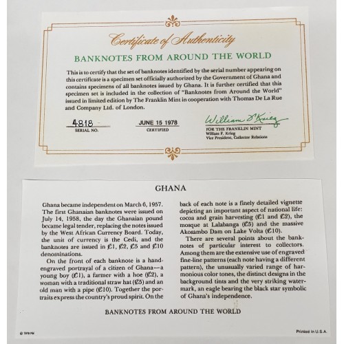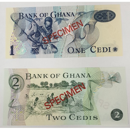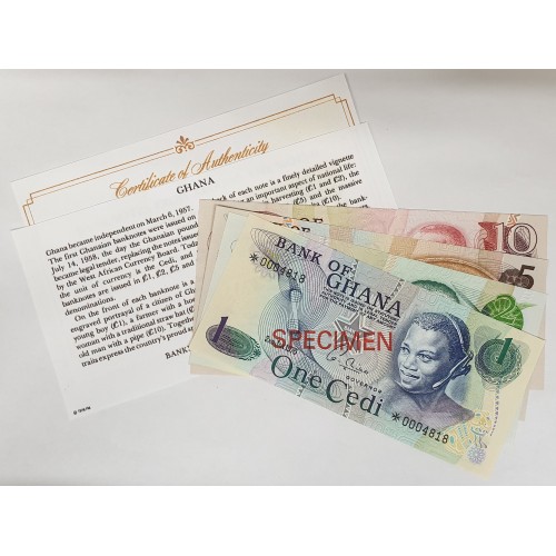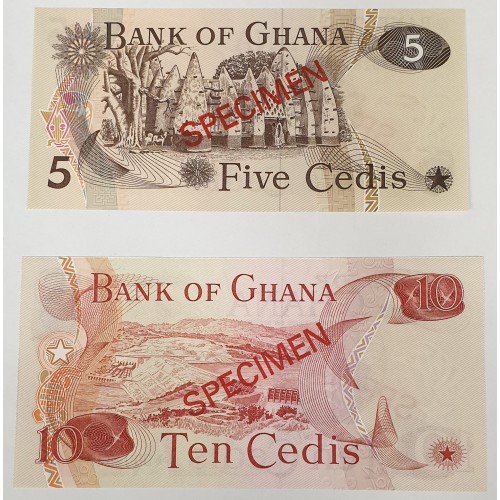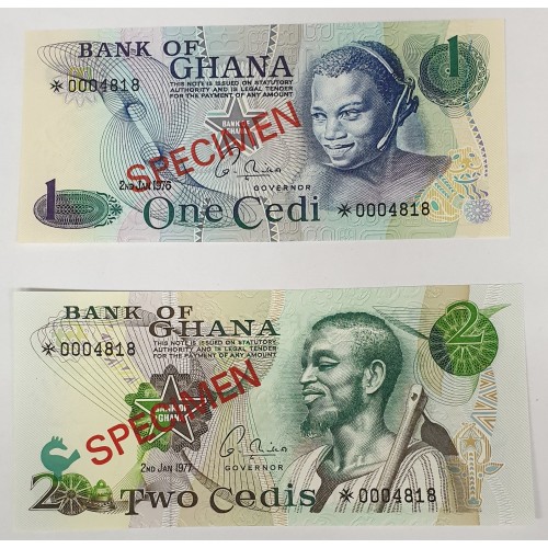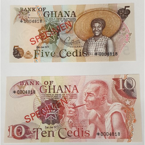 Ghana 1976/7. One 1- Ten 10 Cedi Banknotes. Serial: *0004818. Specimen.
