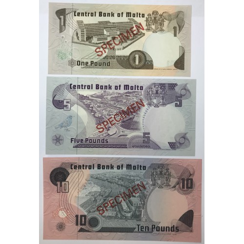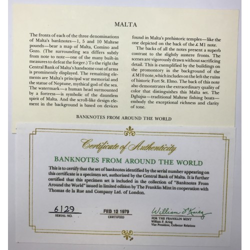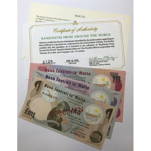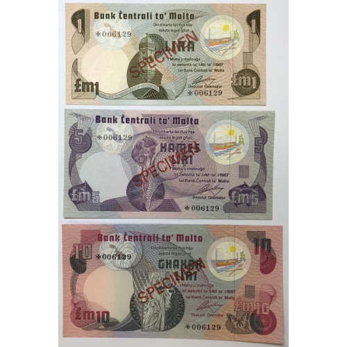 Malta 1967 One 1 Five 5 and Ten 10 Pounds Banknotes. Serial: *006129.