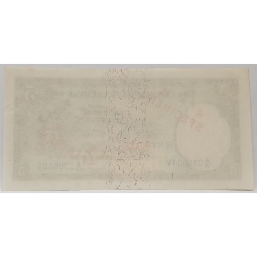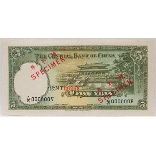 China Republic 1936. Five 5 Yuan Banknote. Serial: A/W000000V / NT00253.