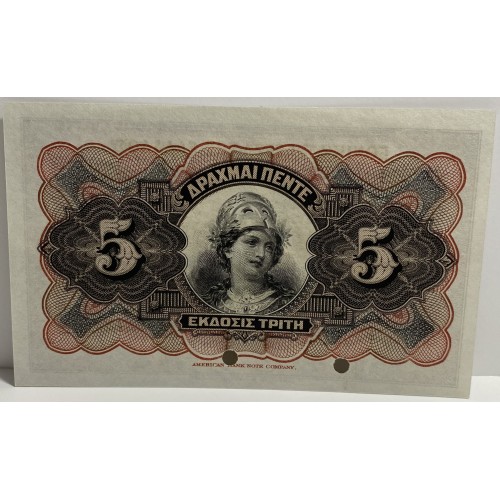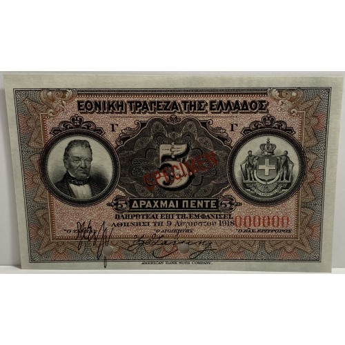 GREECE 1918 . FIVE 5 DRACHMAI BANKNOTE . SPECIMEN