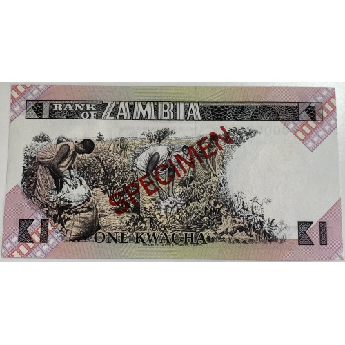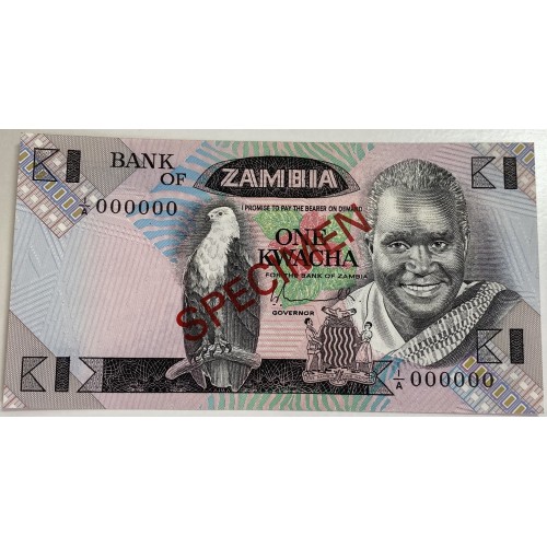 Zambia 1980 One 1 Kwacha Banknote. Serial: I/A 000000. Specimen. Choice