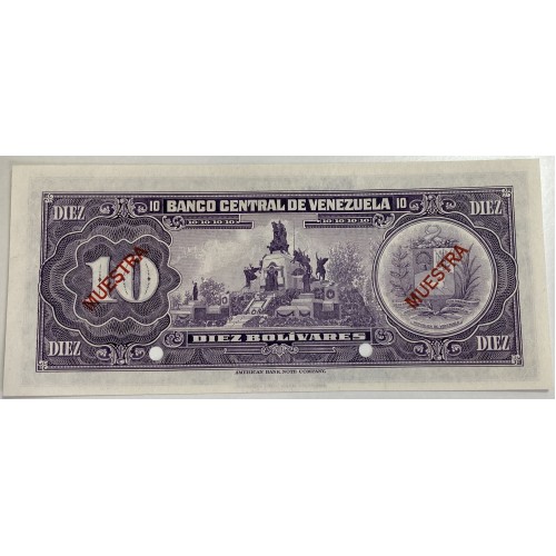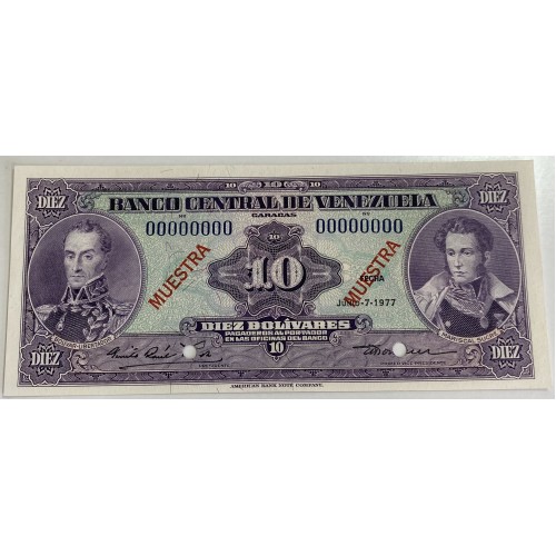 Venezuela 1972 Ten 10 Bolivares Banknote. Serial: 00000000. Specimen. Very