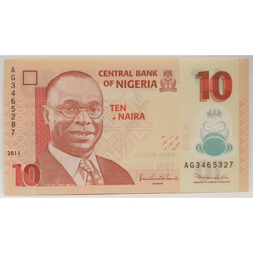 Nigeria 2011 Ten 10 Naira Banknote. Serial: AG3465327/AG3465287. Error.