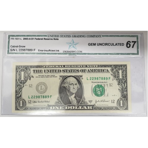 Error. Insufficient Ink. Federal Reserve Note. Gem Uncirculated