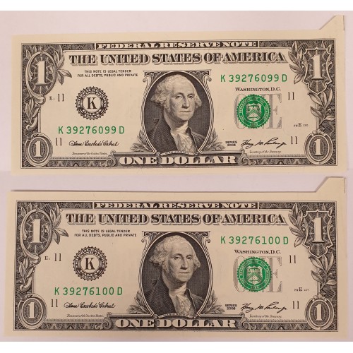 UNITED STATES OF AMERICA 2006 . ONE 1 DOLLAR BANKNOTE . CONSECUTIVE PAIR . ERROR . FLAP FOLD