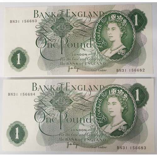 GREAT BRITAIN UK 1966 . ONE 1 POUND BANKNOTES . CONSECUTIVE PAIR . ERROR . MIS-MATCH SERIALS