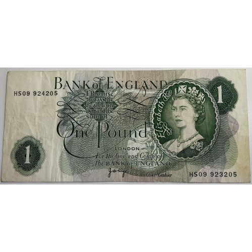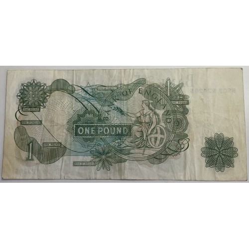 Great Britain UK 1970 One 1 Pound Banknote. Serial: HS09924205/