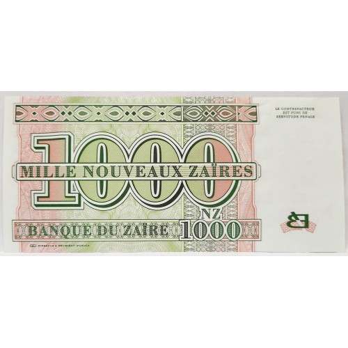 Zaire 1995 One Thousand 1,000 Nouveaux Zaires Banknote. Serial: B5218297N.