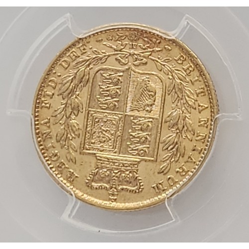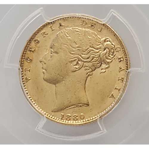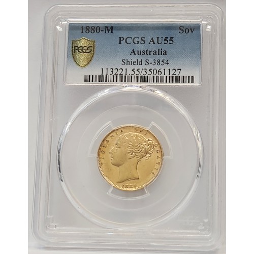 Australia 1880 M One 1 Sovereign. Melbourne. Gold. Shield. Rare. PCGS AU55.