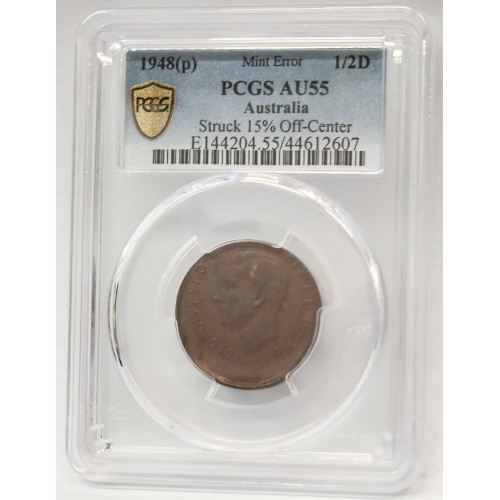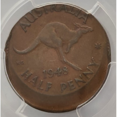Australia 1948 Half 1/2  Penny. Error. Mis-Struck. Slabbed. PCGS AU55.