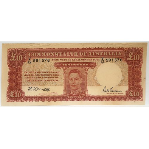 Australia 1943. Ten 10 Pounds Banknote. Armitage/McFarlane. Serial: V12 591576.