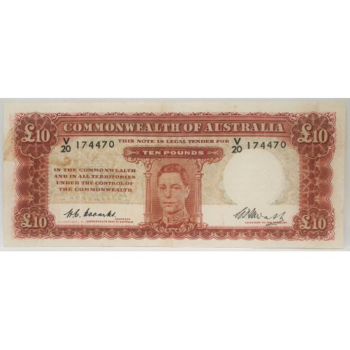 Australia 1949. Ten 10 Pounds Banknote. Coombs/Watt. Serial: V20 174470.