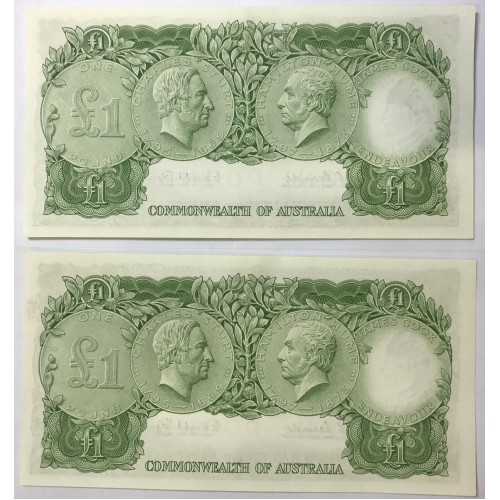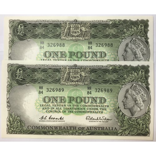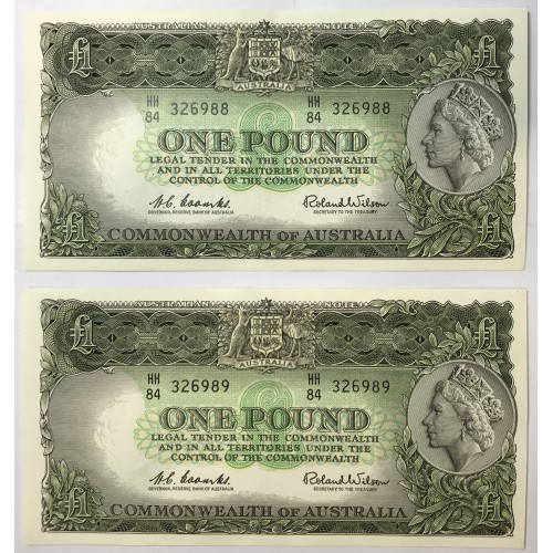 Australia 1961. One 1 Poiund Banknotes. Serial: HH84 326988-9. Coombs/Wilson.