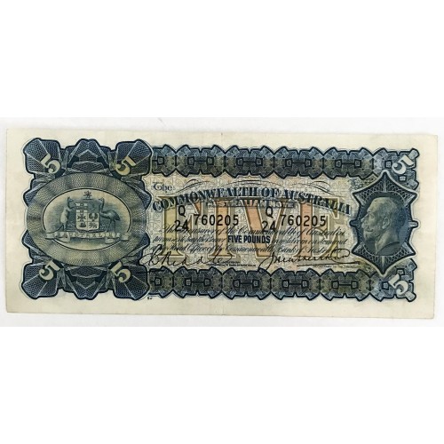 Australia 1927. Five 5 Pounds Banknote. Serial: Q24 760205. Very Scarce.
