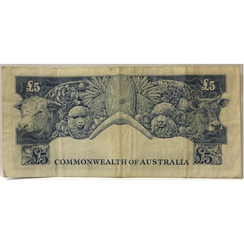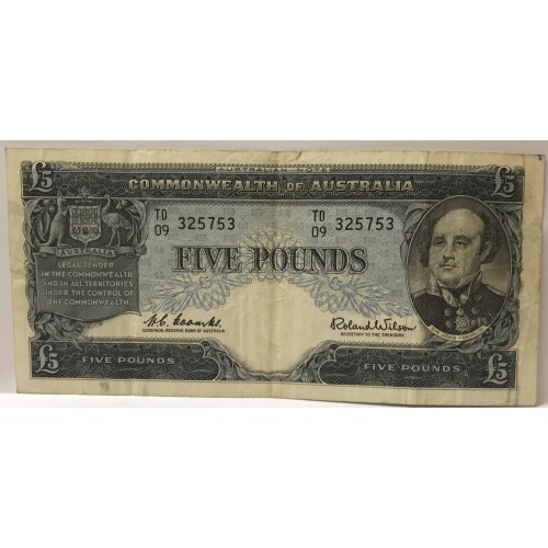 Australia 1960. Five 5 Pounds Banknote. Serial: TD09 325753. Coombs/Wilson.