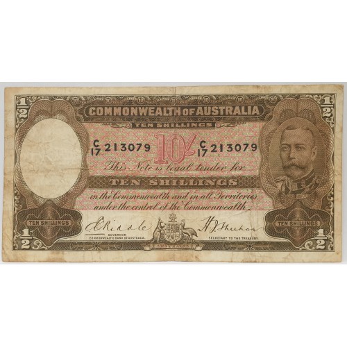 Australia 1933. Ten 10 Shillings Banknote. Serial: C17 213079. Riddle/Sheehan.
