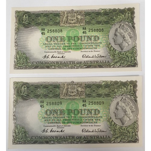 Australia 1953. One 1 Pound Banknotes. Serial: HA45 258808 - 258812.Coombs/