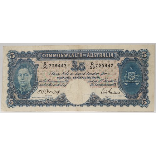 Australia 1941. Five 5 Pounds Banknote. Serial: R56 729447. Armitage/